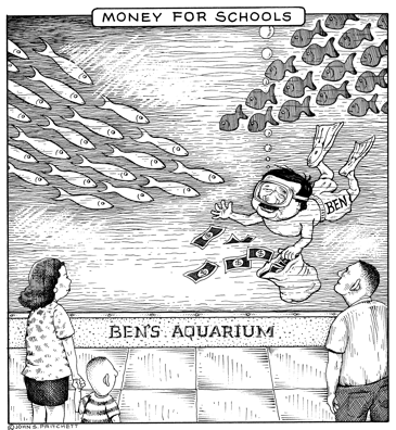 Honolulu Weekly 12-6-00 Hawaii Governor Ben Cayetano wants an aquarium, not money for shcools. Next Cartoon | Previous Cartoon | 2000 | Archives | Home | Search