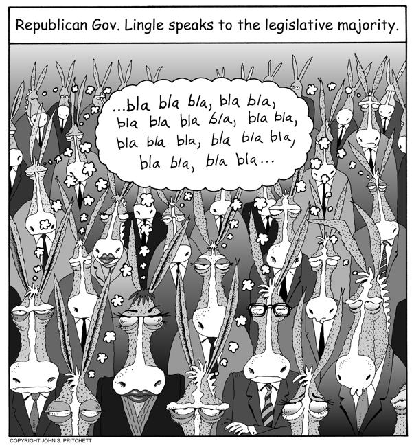 Honolulu Weekly 1-23-08 Hawaii Governor Linda Lingle speaks to the legislative majority. Next Cartoon | Previous Cartoon | 2008 | Archives | Home | Search