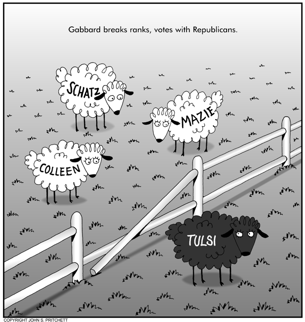 Honolulu Weekly 3-13-13 Democratic Congresswoman Tulsi Gabbard breaks ranks, votes with Republicans. Next Cartoon | Previous Cartoon | 2013 | Archives | Home | Search