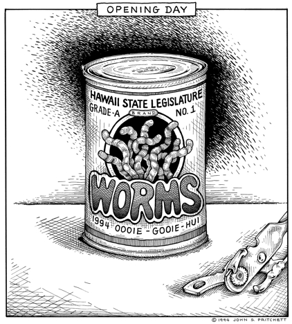 Honolulu Weekly 1-19-94 Opening Day at the Hawaii Legislature is a Can of Worms. Next Cartoon | Previous Cartoon | 1994 | Archives | Home | Search