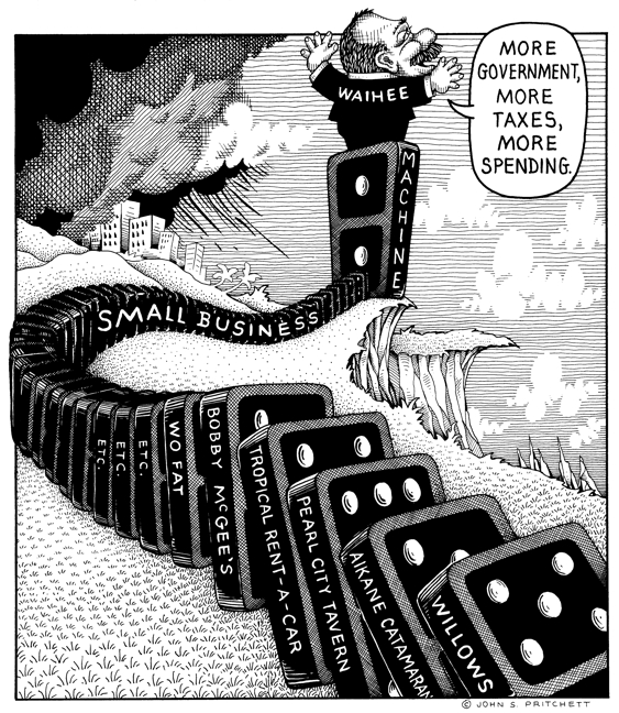 Honolulu Weekly 10-20-93 Governor Waihee's big government policies create a domino effect of business failures. Next Cartoon | Previous Cartoon | 1993 | Archives | Home | Search