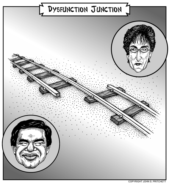 Honolulu Weekly 6-21-06 Dysfunction Junction, city, state on wrong track for rail transit Next Cartoon | Previous Cartoon | 2006 | Archives | Home | Search