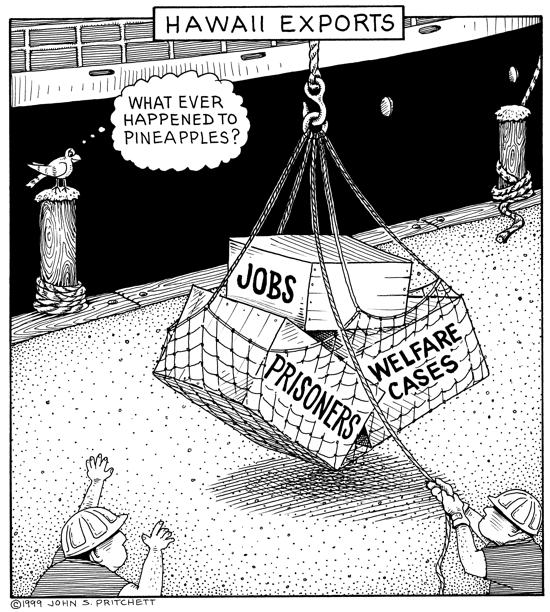 Honolulu Weekly 11-24-99 Hawaii's biggest exports: jobs, welfare cases and prisoners. Next Cartoon | Previous Cartoon | 1999 | Archives | Home | Search