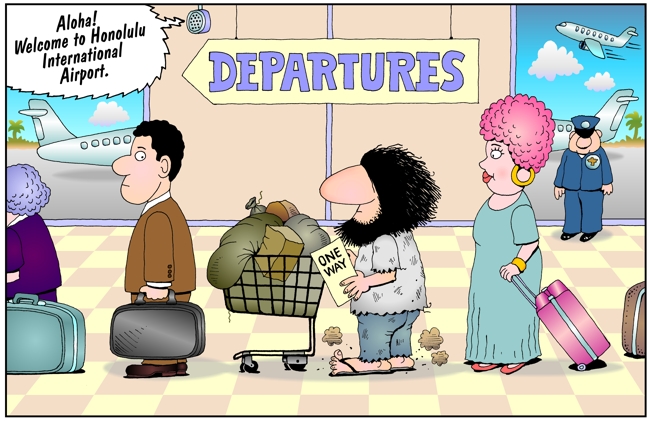 Hawaii's fly the homeless home project Pritchett Cartoon for Honolulu Civil Beat, August 8, 2013 | To comment, Email Pritchett Next Cartoon | Previous Cartoon | Civil Beat Pritchett Cartoon Archives | Home Page
