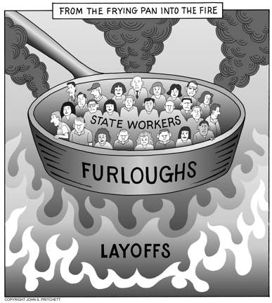 Honolulu Weekly 7-22-09 State workers go from the frying pan into the fire. Next Cartoon | Previous Cartoon | 2009 | Archives | Home | Search