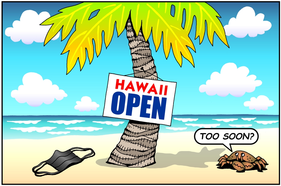 COVID restrictions eased, Hawaii opens up. Pritchett Cartoon for Honolulu Civil Beat, June 13, 2021 | To comment, Email Pritchett Next Cartoon | Previous Cartoon | Civil Beat Pritchett Cartoon Archives | Home Page