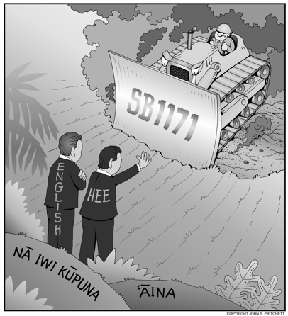 Honolulu Weekly 5-1-13 English and Hee Oppose SB1171 to Protect Iwi Kupuna. | See it in Color Next Cartoon | Previous Cartoon | 2013 | Archives | Home | Search