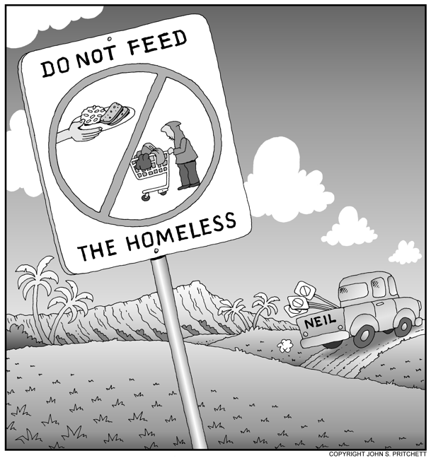 Honolulu Weekly 5-25-11 Do not feed the homeless says Hawaii Governor Neil Abercrombie. | See it in Color Next Cartoon | Previous Cartoon | 2011 | Archives | Home | Search