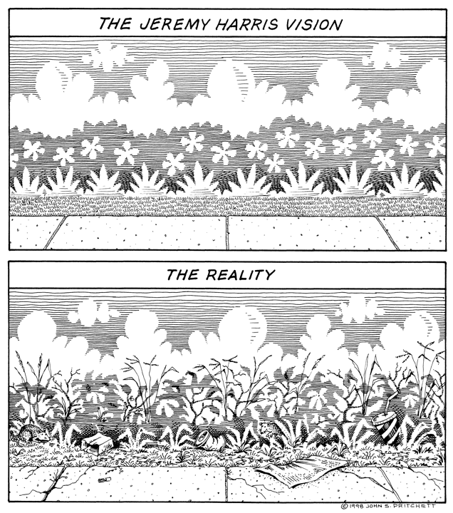 | Everyone loves to see beautiful flower gardens and landscaping around the city, especially in Hawaii. Seeing a fast and flashy way to enhance his image, Jeremy planted flowers and shrubs up and down the Ala Wai, and here, and there and everywhere. Who could possibly object? Initially for the photo-op it all looks great, but then reality sets in. Jeremy forgot that in Hawaii, weeds grow like crazy and that some types of landscaping foliage can create a habitat for rats and collect rubbish. Did Jeremy fail to realize that more flower gardens would mean more money for maintenance, or was the photo-op good enough? Honolulu Weekly cartoon 10-7-1998 |