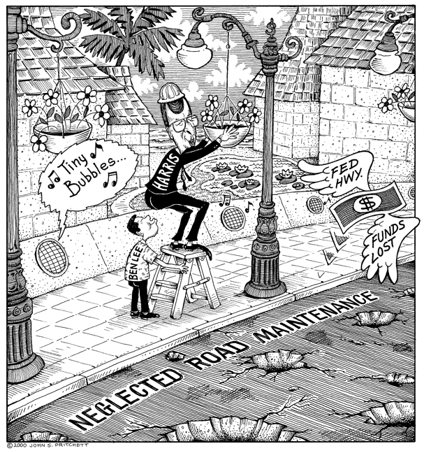 | Just a few years after spending $750,000 on the so-called Waikiki beautification project, Jeremy decided to tear it all down and spend $13 million on a new project. He let his little buddy Ben Lee, city managing director and wannabe architect, fulfill his wildest architectural dreams designing the project. The plans called for more buildings, more concrete, fake waterfalls and lily ponds, old-fashioned light poles with flower baskets and underground speakers. There was considerable community opposition to the plan, but as Jeremy has expressed candidly, he makes the decisions, not the community, because "that's leadership." Meanwhile, city roads are full of potholes due to years of neglect and federal highway funds are lost to bungling by the Harris administration. See: Potholes | Honolulu Weekly cartoon 2-9-2000 |