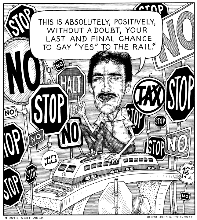 Honolulu Weekly 5-12-93 Councilman Gary Gill continues to push rail after the program has been firmly rejected. Next Cartoon | Previous Cartoon | 1993 | Archives | Home | Search