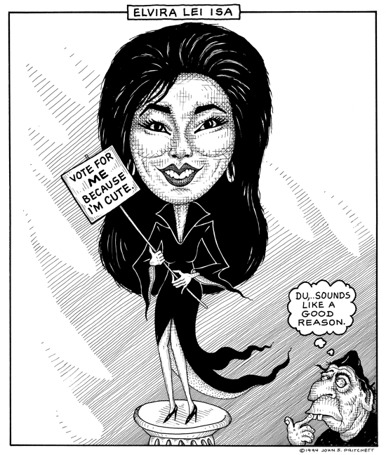 Honolulu Weekly 10-19-94 Lei Ahu Isa is Elvira at Haloween time, runs for Honolulu City Council. Next Cartoon | Previous Cartoon | 1994 | Archives | Home | Search