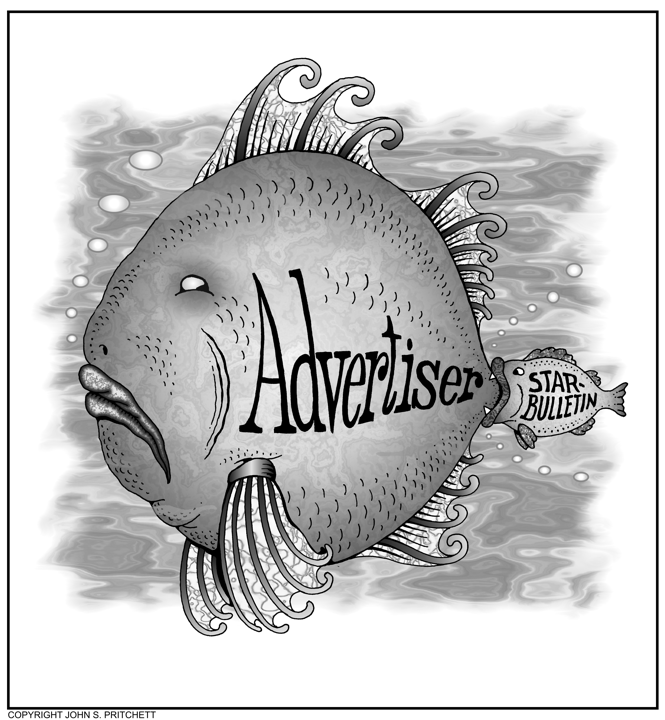 Honolulu Weekly 3-3-10 Homolulu Star-Bulletn newspaper to buy larger Honolulu Advertiser. | See it in Color Next Cartoon | Previous Cartoon | 2010 | Archives | Home | Search