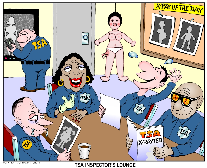 A candid, satirical view inside the TSA inspector's lounge. For details on usage Email Pritchett Transportation Cartoons | Home Page | Site Map