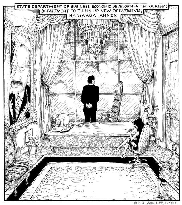 Honolulu Weekly 12-8-93 Bloated Hawaii state government department to think up new departments. Next Cartoon | Previous Cartoon | 1993 | Archives | Home | Search