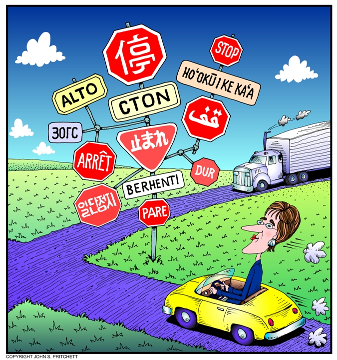 Where will multilingual, political correctness in the U.S. stop? For details on usage or to purchase original art please Email Pritchett Archives | Home Page | Site Map | Search
