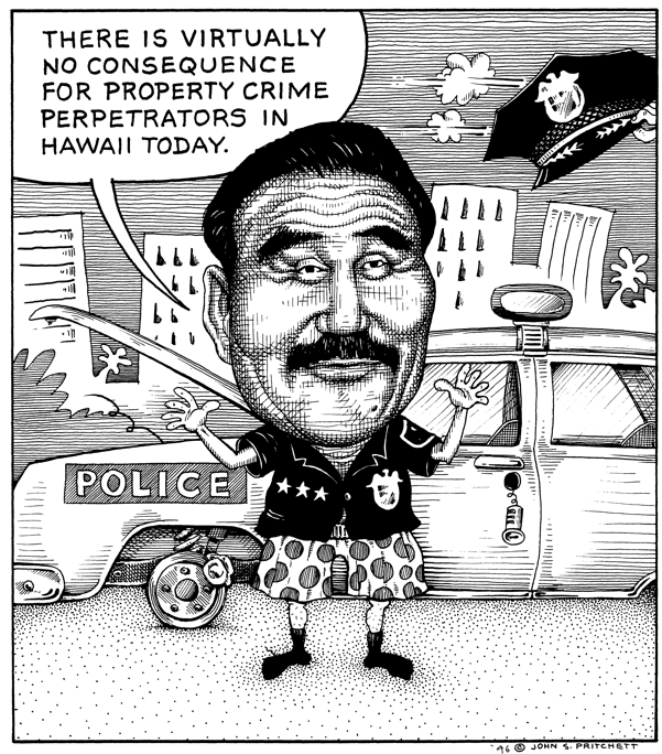 Honolulu Weekly 7-31-96 Honolulu Police Chief Michael Nakamura gets ripped off. Next Cartoon | Previous Cartoon | 1996 | Archives | Home | Search