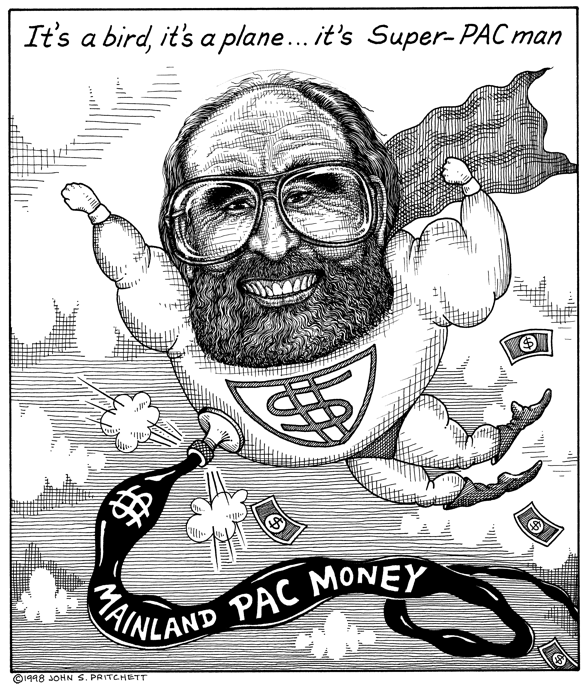 Honolulu Weekly 6-17-98 Congressman Neil Abercrombie gets big bucks from Political Action Committees. Next Cartoon | Previous Cartoon | 1998 | Archives | Home | Search
