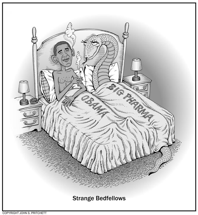 Honolulu Weekly 8-19-09 Strange Bedfellows, Obama in bed with big pharmaceutical companies. Next Cartoon | Previous Cartoon | 2009 | Archives | Home | Search