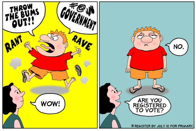 No vote, no grumble! Register to vote! Pritchett Cartoon for MidWeek, July 2, 2014 | To comment, Email Pritchett Next Cartoon | Previous Cartoon | MidWeek Pritchett Cartoon Archive | Home Page | Search