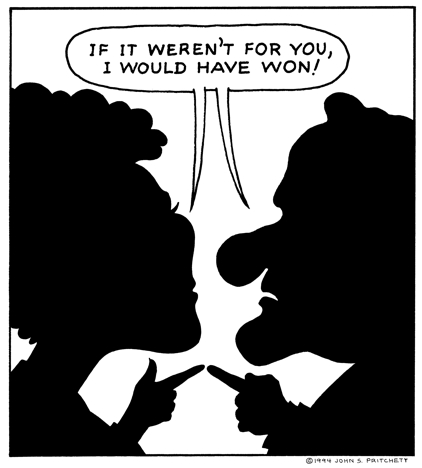 Honolulu Weekly 11-23-94 Contenders in 1994 Hawaii governor's Race, Saiki and Fasi blame each other of loss. Next Cartoon | Previous Cartoon | 1994 | Archives | Home | Search