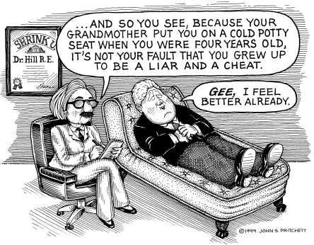 "Dr. Hillary Clinton, the Psychiatrist" For details on usage or to purchase the original artwork: Email Pritchett Clinton Cartoons | Home Page | Site Map | Search