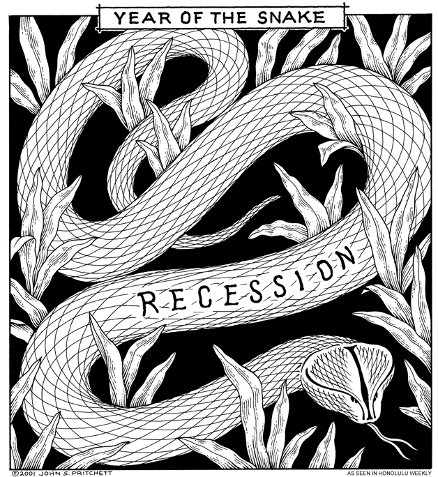 Honolulu Weekly 1-3-01 "Year of the Snake, Economic Recession" | See it in Color Next Cartoon | Previous Cartoon | 2001 | Archives | Home | Search