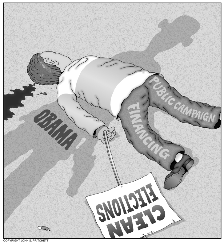 Honolulu Weekly 6-25-08 Obama breaks promise, opts out of public campaign financing, killing it. | See it in Color Next Cartoon | Previous Cartoon | 2008 | Archives | Home | Search
