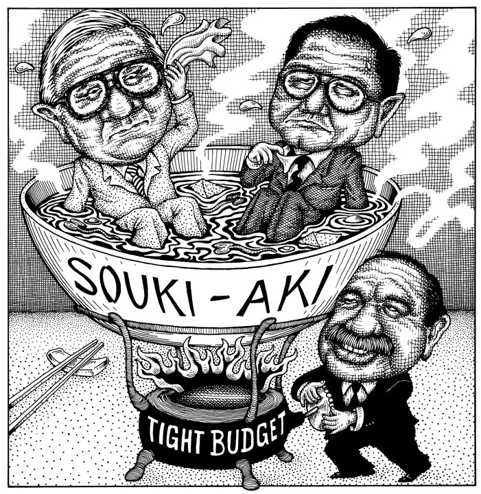 Honolulu Weekly 2-3-93 Waihee turns up the heat on House Speaker Souki and Senate President Aki. Next Cartoon | Previous Cartoon | 1993 | Archives | Home | Search