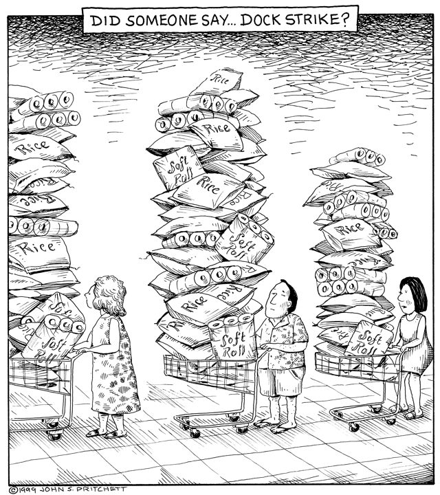 Honolulu Weekly 10-20-99 Threat of dock strike causes run on rice and tolit paper. Next Cartoon | Previous Cartoon | 1999 | Archives | Home | Search