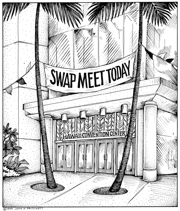 Honolulu Weekly 3-24-99 Expensive new convention center has no bookings, becomes venue for swap meet. Next Cartoon | Previous Cartoon | 1999 | Archives | Home | Search