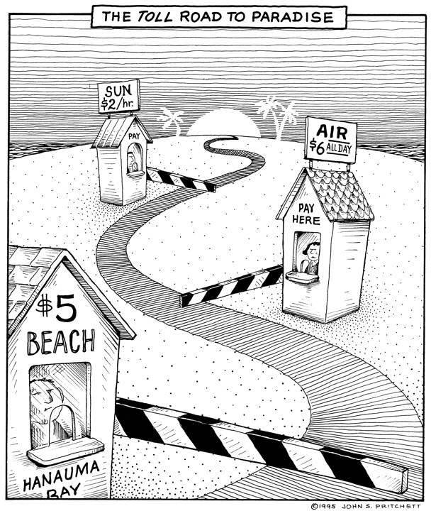 Honolulu Weekly 7-5-95 City begins charging fee to visit Hanauma Bay. Fees for sun and air to follow? Next Cartoon | Previous Cartoon | 1995 | Archives | Home | Search