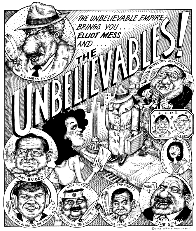 Honolulu Weekly 11-3-93 Like a crime novel, 1993 provided a cast of shady characters and misdeeds in Hawaii government. Next Cartoon | Previous Cartoon | 1993 | Archives | Home | Search