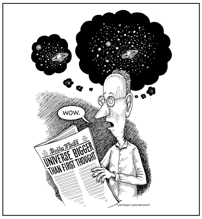 Honolulu Weekly 12-1-99 Universe bigger than first thought, astronomy, astrophysics, media cartoon. Next Cartoon | Previous Cartoon | 1999 | Archives | Home | Search