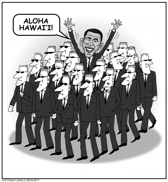 Honolulu Weekly 8-13-08 Barack Obama vacations in Hawaii with Secret Service all around. Next Cartoon | Previous Cartoon | 2008 | Archives | Home | Search