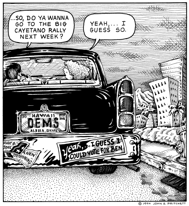 Honolulu Weekly 4-13-94 Little enthusiasm for gubernatorial frontrunner Ben Cayetano. Next Cartoon | Previous Cartoon | 1994 | Archives | Home | Search