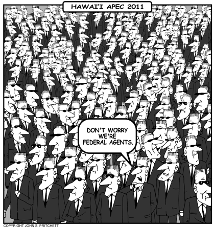 Honolulu Weekly 11-9-11 Hawaii APEC Security, Federal Agents. Next Cartoon | Previous Cartoon | 2011 | Archives | Home | Search