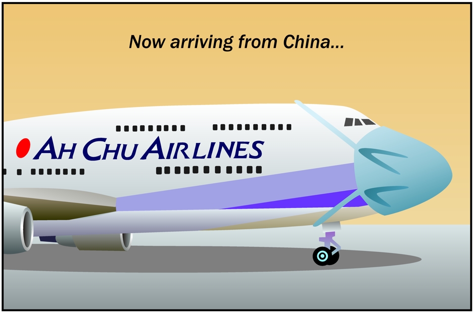 Airliners from China could spread coronavirus. Pritchett Cartoon for MidWeek February 5, 2020 | To comment, Email Pritchett Next Cartoon | Previous Cartoon | MidWeek Pritchett Cartoon Archive | Home Page