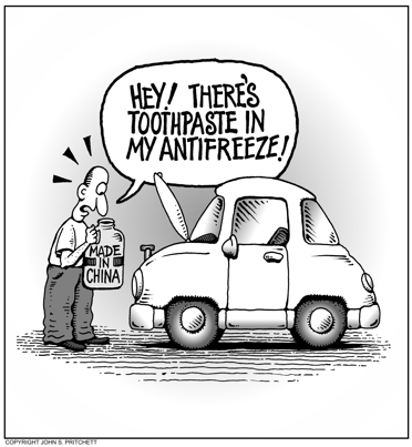 Honolulu Weekly 7-11-07 Made in China - Hey! There's toothpaste in my antifreeze! | See it in Color Next Cartoon | Previous Cartoon | 2007 | Archives | Home | Search