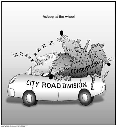 Honolulu Weekly 8-8-12 Honolulu Mayor Peter Carlisle asleep at the wheel, corruption in city road division. Next Cartoon | Previous Cartoon | 2012 | Archives | Home | Search