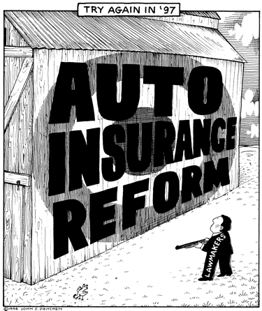 Honolulu Weekly 12-31-96 Legislature fails to pass auto insurance reform, can't hit the target. Next Cartoon | Previous Cartoon | 1996 | Archives | Home | Search