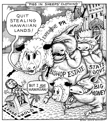 Honolulu Weekly 3-23-94 With expensive PR campaign disguise, Bishop Estate removes residents from their homes. Next Cartoon | Previous Cartoon | 1994 | Archives | Home | Search