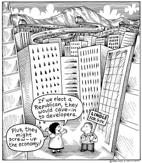 Honolulu Weekly 5-13-98 For 40 years Hawaii Democrats have allowed unbridled development. Next Cartoon | Previous Cartoon | 1998 | Archives | Home | Search