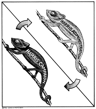 Harris administration changes into Harris reelection campaign like a chameleon. Next Cartoon | Previous Cartoon | 1996 | Archives | Home | Search