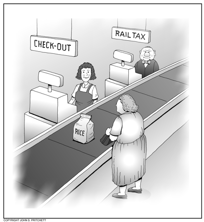 Honolulu Weekly 1-12-11 Honolulu residents pay more for a bag of rice with the added rail transit tax. Next Cartoon | Previous Cartoon | 2011 | Archives | Home | Search