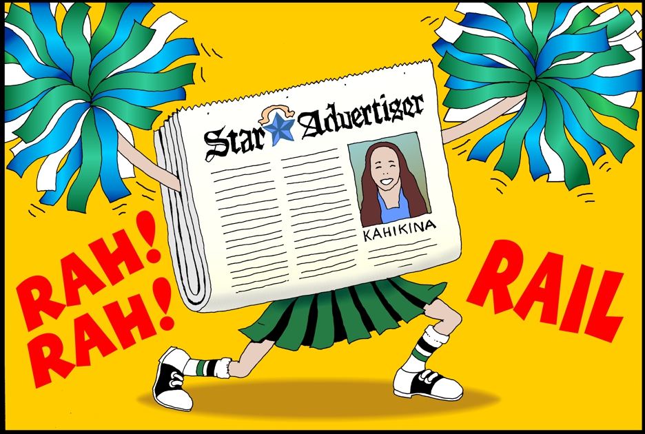Honolulu Star Advertiser is Cheerleader for Rail. Pritchett Cartoon for Honolulu Civil Beat, June 11, 2023 | To comment, Email Pritchett Next Cartoon | Previous Cartoon | Civil Beat Pritchett Cartoon Archives | Home Page