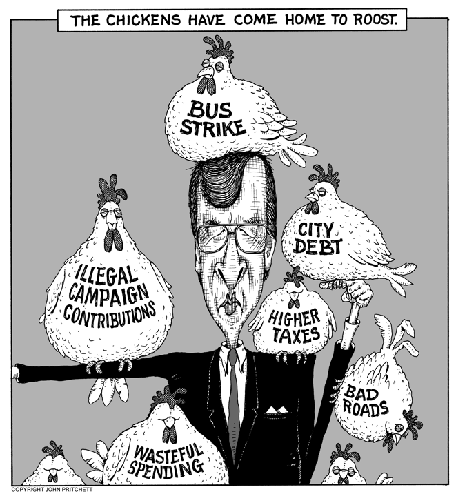 | Running for reelection in 2000 and aiming to be governor in 2002, Honolulu Mayor Jeremy Harris neglected many basic city functions in favor of more glamorous projects that could boost his campaigns. The consequences of this neglect would be left to his predecessor while he moved on to be governor. But on May 30, 2002, under the cloud of a criminal campaign contribution investigation, Harris dropped out of the governor's race. By August of 2003, when this cartoon appeared, it was clear that the chickens had finally come home to roost on their rightful owner. Honoluolu weekly cartoon 8-27-2003 |
