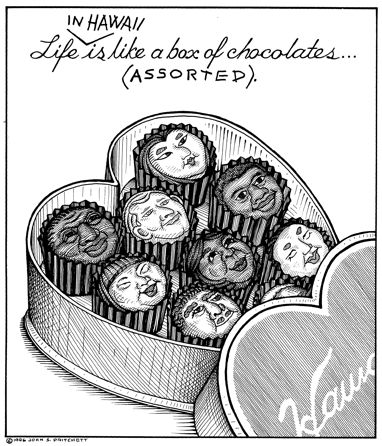 Honolulu Weekly 2-7-96 Hawaii is like a box of chocolates - assorted. Next Cartoon | Previous Cartoon | 1996 | Archives | Home | Search