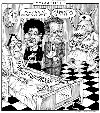 Honolulu Weekly 8-18-93 Republican team in 1994 Hawaii governor's race try to wake Hawaii voters from coma. Next Cartoon | Previous Cartoon | 1993 | Archives | Home | Search