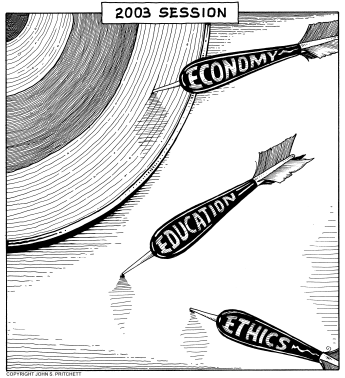 Honolulu Weekly 5-7-03 2003 Hawaii legislative session misses the mark Next Cartoon | Previous Cartoon | 2003 | Archives | Home | Search